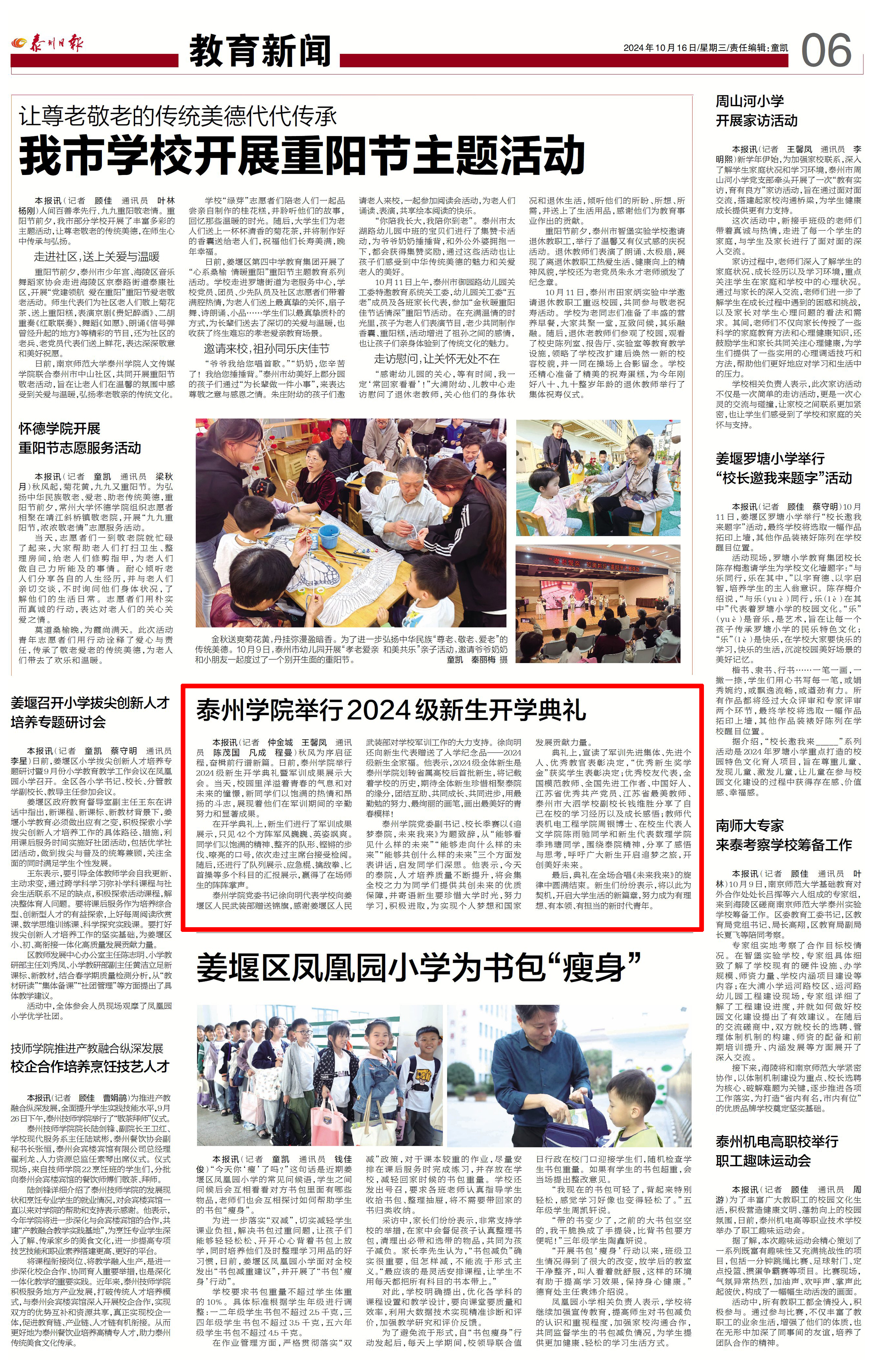 《泰州日报》2024年10月16日报道Ky开元举行2024级新生开学典礼