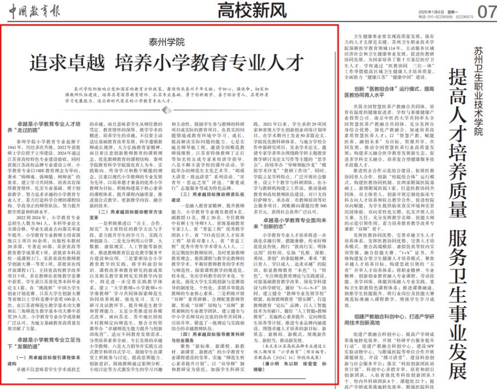 《中国教育报》2025年1月6日报道《Ky开元集团 追求卓越 培养小学教育专业人才》