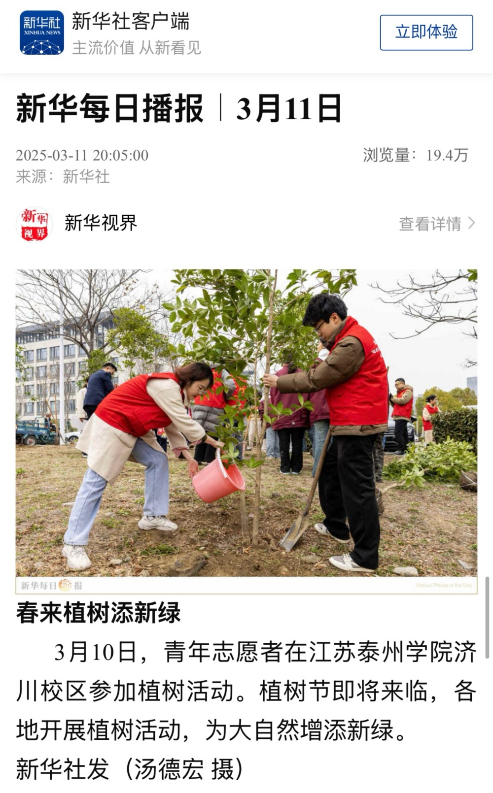 《新华社》2025年3月11日报道《春来植树添新绿》