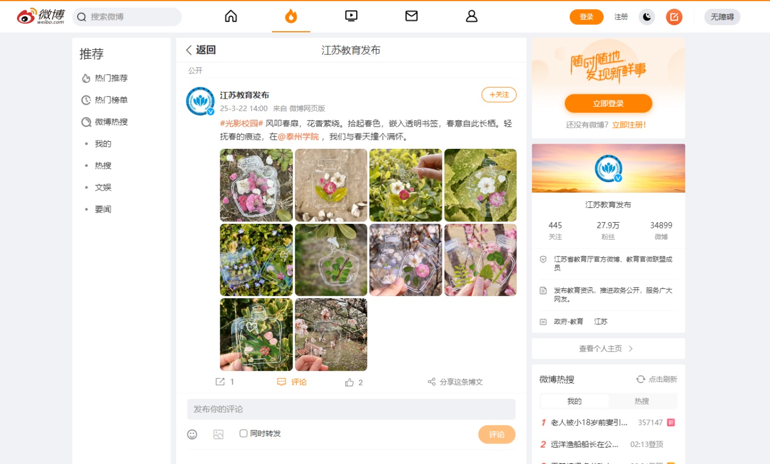 《江苏教育发布》微博2025年3月22日发布学校花朵书签组图