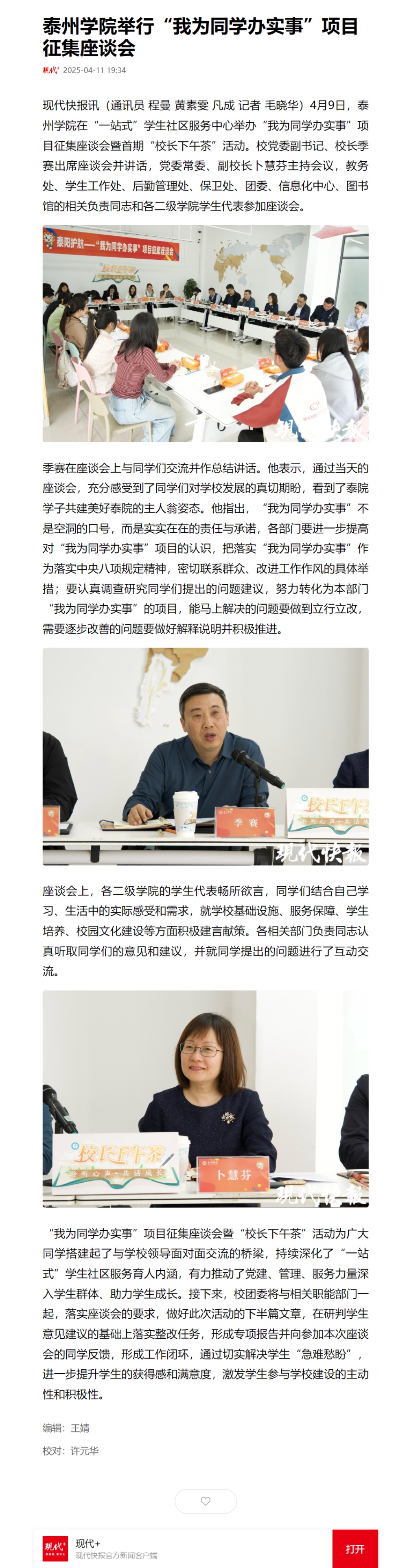 《现代+》2025年4月11日报道《Ky开元集团举行“我为同学办实事”项目征集座谈会》