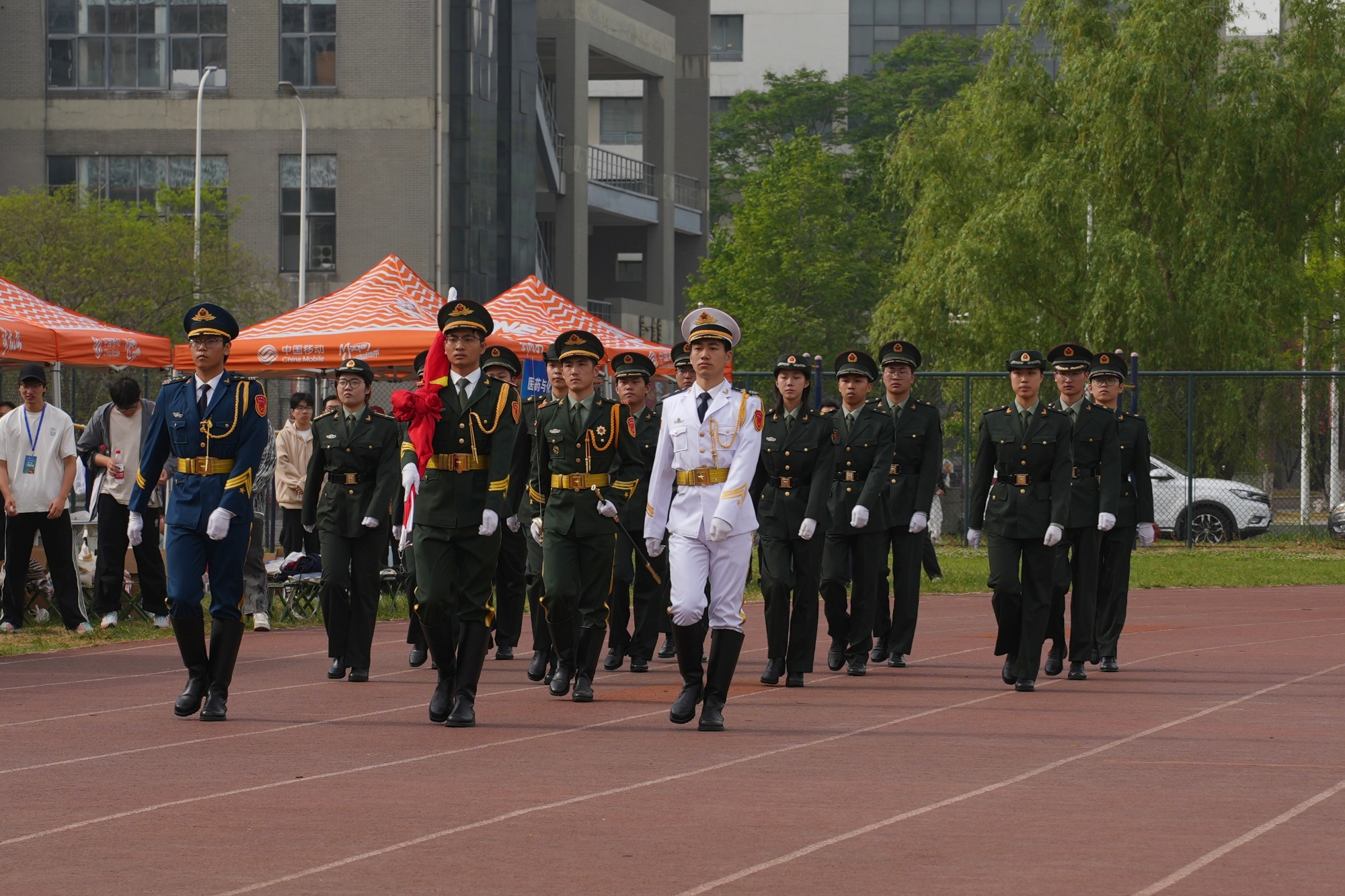 在激昂的《运动员进行曲》中,国旗、校旗、会旗率先入场,各学院运动员及裁判员方阵紧随其后,以饱满的精神风貌依次通过主席台、列队就位。伴随雄壮的国歌声,全体师生肃立注目,五星红旗冉冉升起,为赛场注入昂扬斗志。