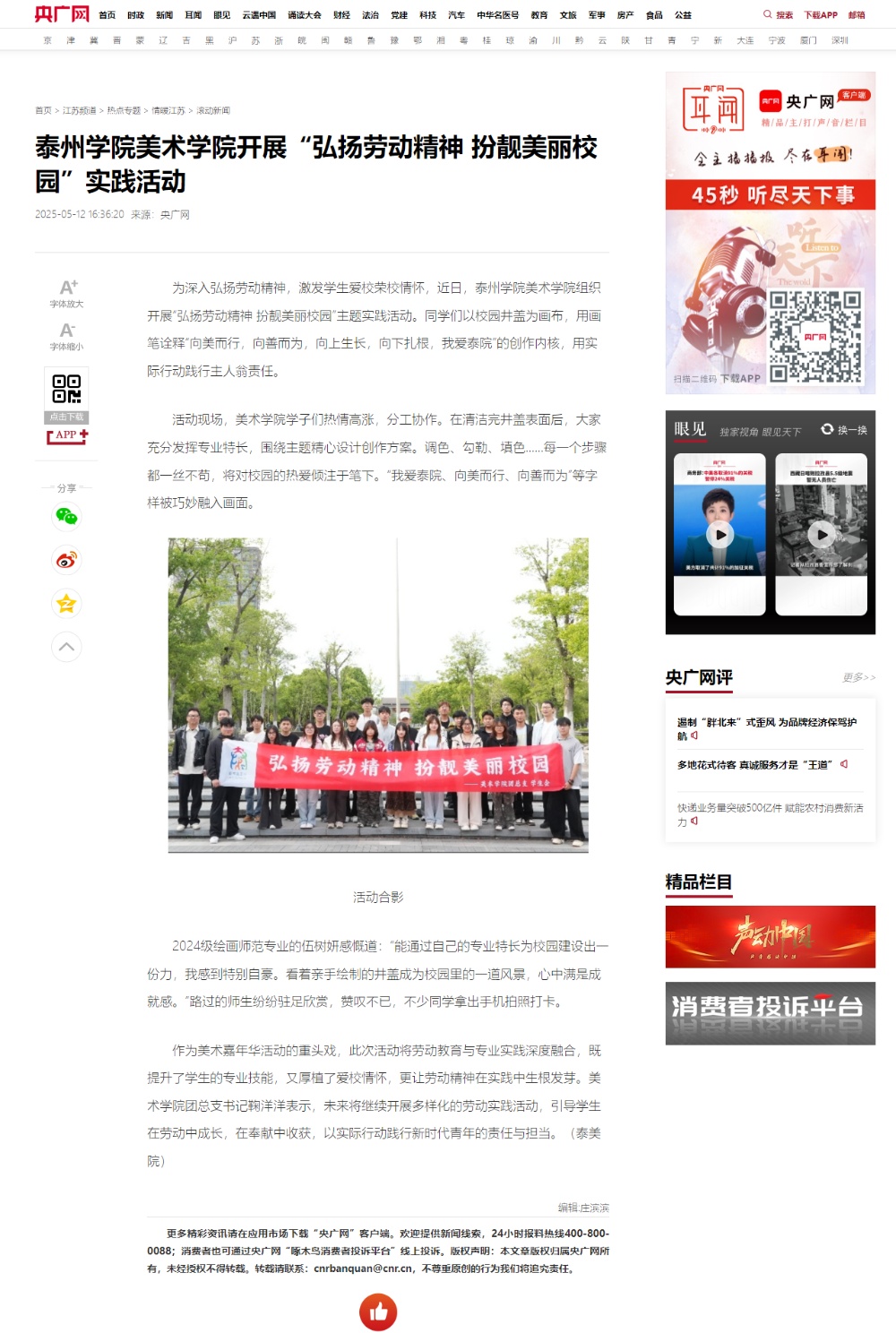 2025年5月12日《央广网》报道《Ky开元集团美术学院开展“弘扬劳动精神 扮靓美丽校园”实践活动》