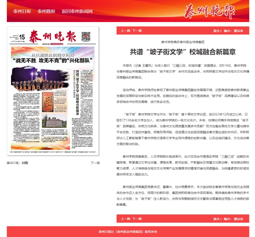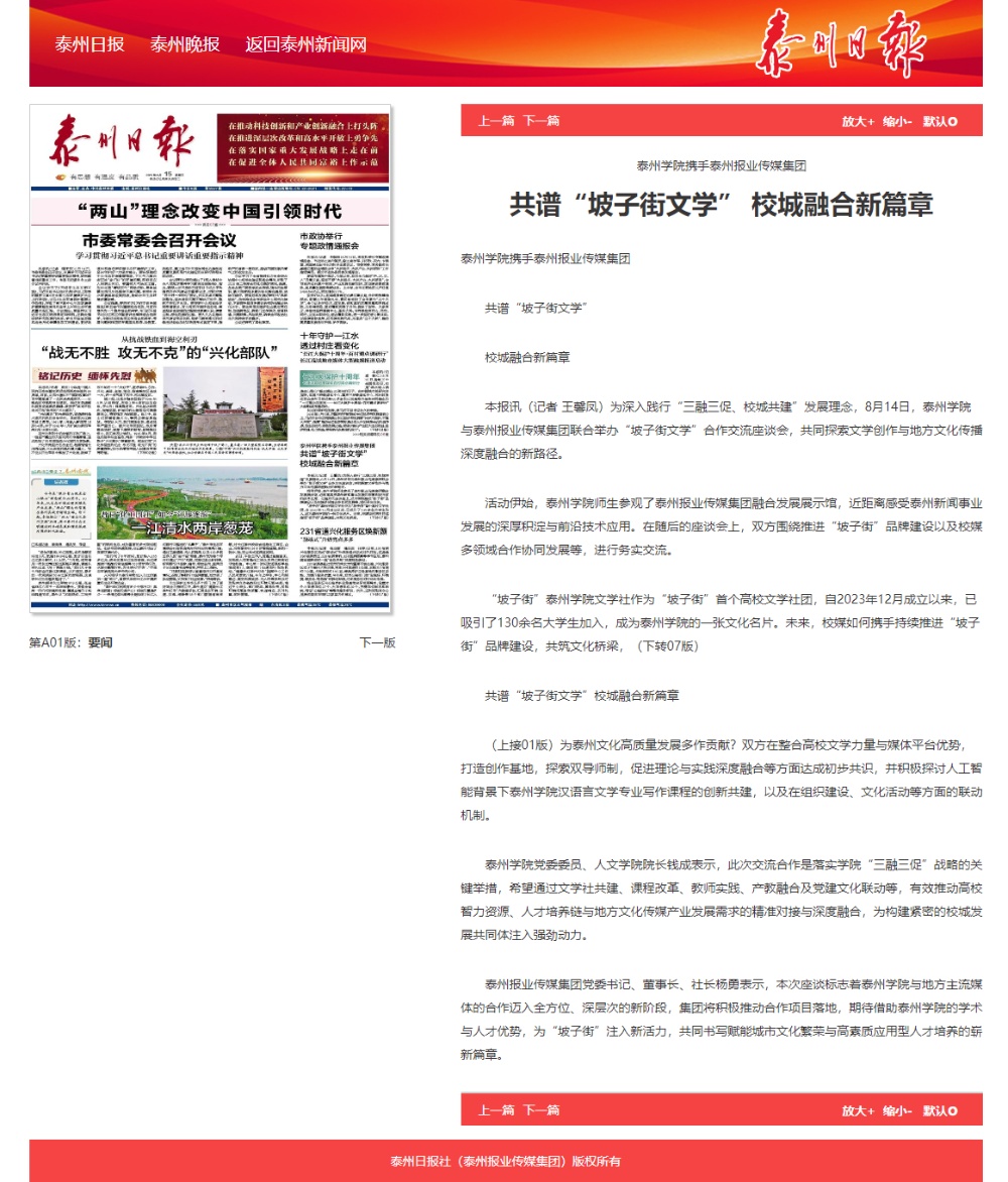 《泰州日报》《泰州晚报》2025年8月15日报道Ky开元携手泰州报业传媒集团共谱“坡子街文学” 校城融合新篇章