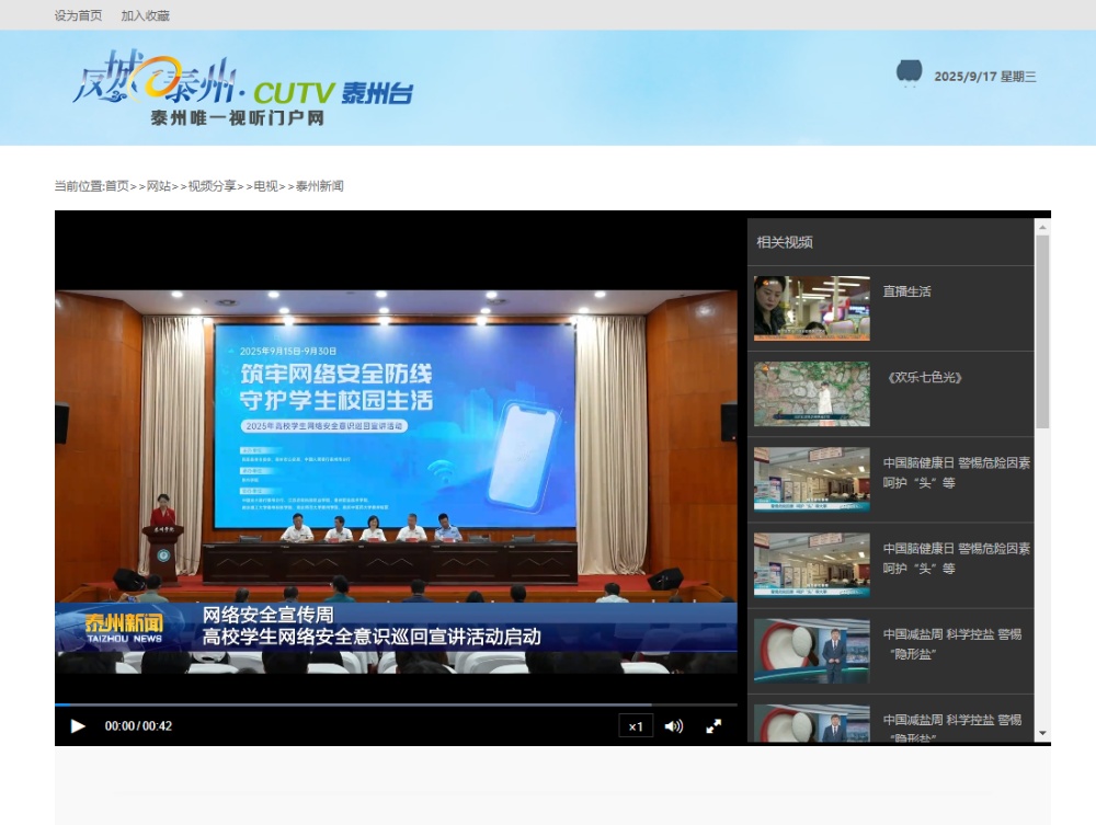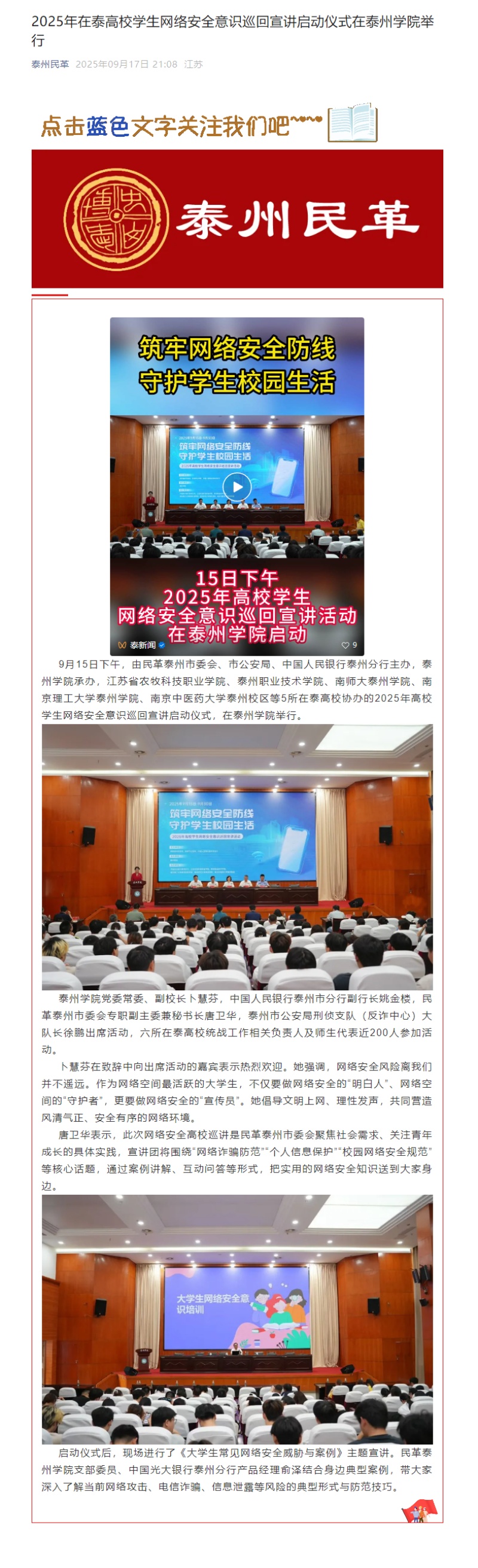 《泰州广播电视台》《泰州民革》2025年9月16日、17日报道2025年在泰高校学生网络安全意识巡回宣讲启动仪式在Ky开元举行