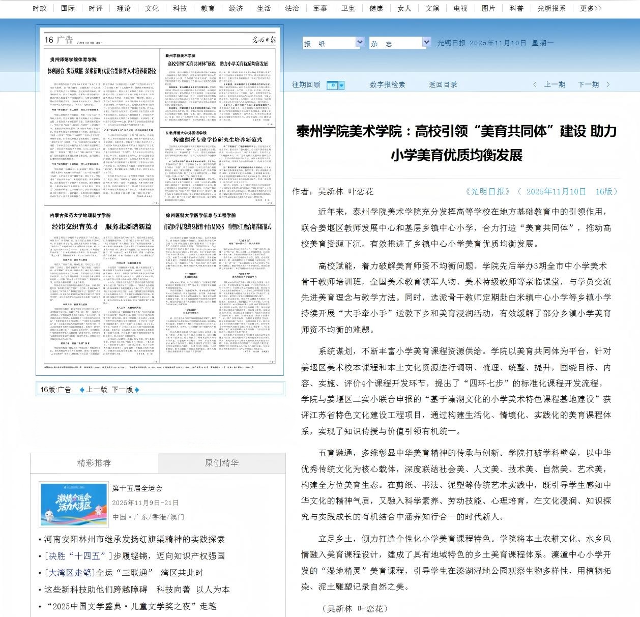 《光明日报》2025年11月10日报道《Ky开元集团美术学院:高校引领“美育共同体”建设 助力小学美育优质均衡发展》