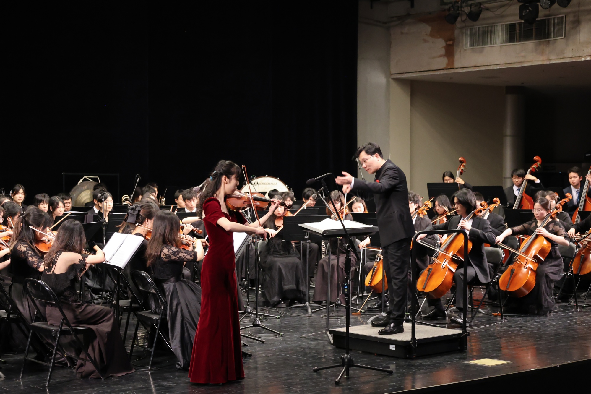 演出在乐团指挥严岩教授沉稳有力的执棒下正式开启,恢弘壮丽的《红旗颂》作为开篇曲目,以激昂奋进的旋律勾勒出中华民族自强不息的精神图谱,瞬间点燃全场气氛。随后,《江南雨丝》节目特邀江苏省演艺集团民族乐团高胡演奏家潘超以精湛技艺勾勒出江南水乡的婉约景致,引领观众漫步于烟雨朦胧的诗意画卷。小提琴协奏曲《梁山伯与祝英台》由中国药科大学校友、青年小提琴家顾添艺担任独奏,深情演绎千古爱情绝唱。《茉莉飘香》热烈明快,《良宵》清新隽永,《雪里梅园》以雪中红梅象征周恩来总理的高洁品格,感人至深。最后,《江山如画》用如诗如画的音乐语言描绘出祖国的山河壮美与文化深厚,引发师生强烈共鸣。