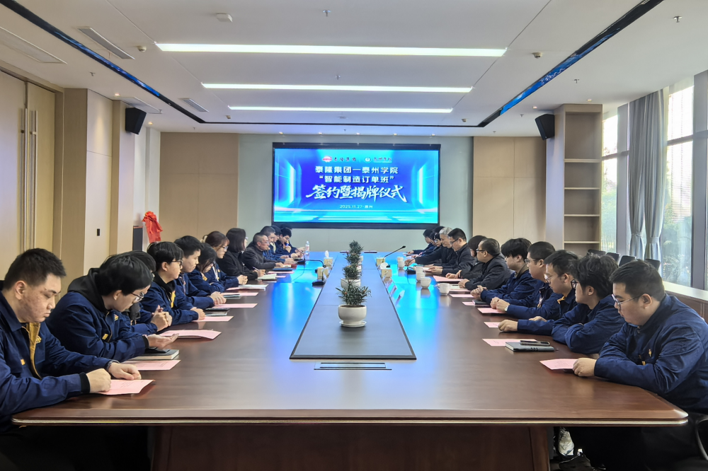 为深入践行“三融三促”校地共建体制机制,推动产教融合从“表层联动”迈向“深度共生”,精准匹配装备制造产业人才需求,11月27日下午,校党委常委、副校长汤艳峰带领机电工程学院相关人员及首届“智能制造订单班”20名学生,赴泰隆集团开展“订单班”签约揭牌仪式,共同擘画校企协同育人新蓝图。泰隆集团总经理殷爱国、总工程师孔霞等领导接待来访。