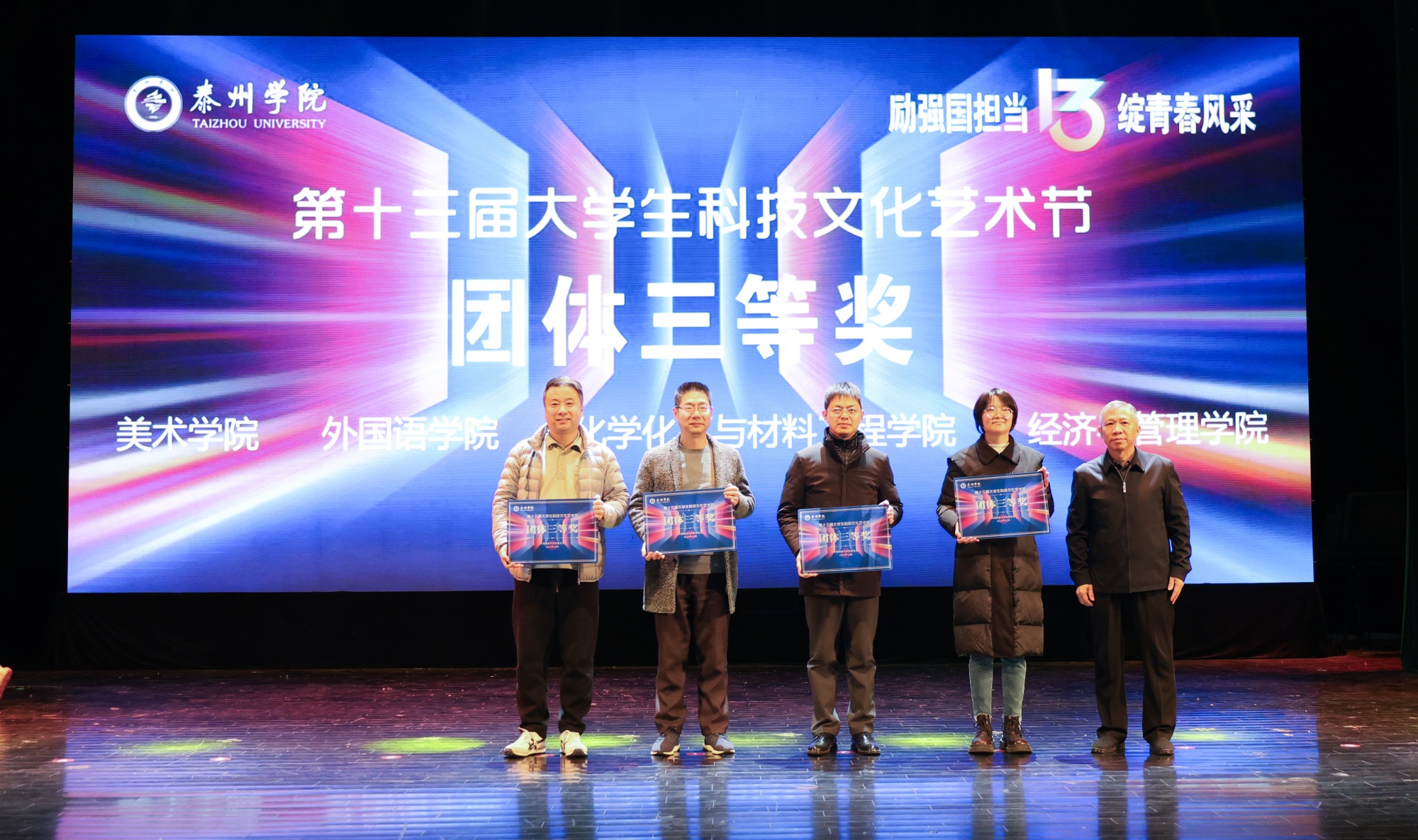 闭幕式上,徐向明为获得本届大学生科技文化艺术节团体一等奖的教育科学学院、信息工程学院和人文学院颁奖;冯锋为获得团体二等奖的音乐学院、机电工程学院、数理学院和药学院颁奖;徐庆国为获得团体三等奖的外国语学院、化学化工与材料工程学院、美术学院和经济与管理学院颁奖。
