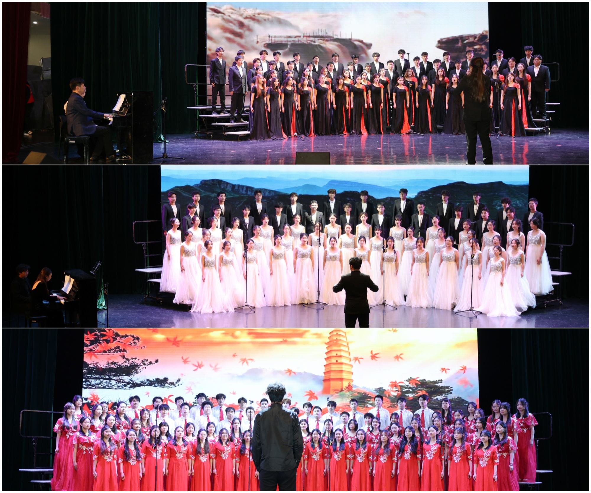 卜慧芬、魏小星为纪念“一二·九”大合唱比赛的获奖队伍颁奖。比赛中,来自全校11个二级学院的代表队依次登台,演唱了精心准备的两首参赛曲目,以歌声致敬峥嵘历史、以旋律礼赞伟大时代。最终,音乐学院、数理学院、人文学院获得大合唱比赛一等奖,外国语学院、机电工程学院、化学化工与材料工程学院和信息工程学院获得二等奖,经济与管理学院、教育科学学院、药学院和美术学院获得三等奖。