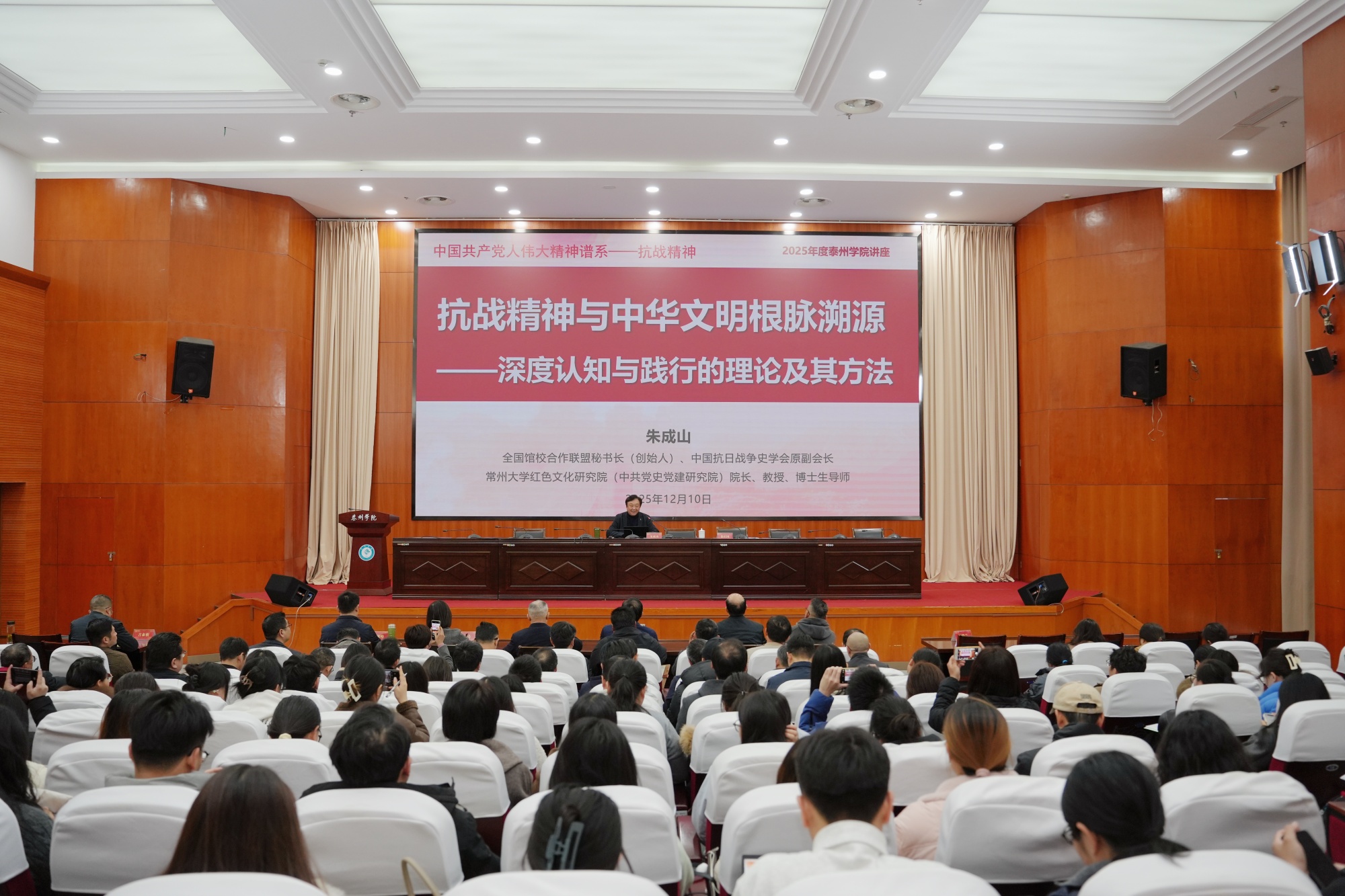 宣讲中,朱成山教授以《抗战精神与中华文明根性溯源—— 深度认知与践行的理论及其方法》为题,凭借 30 余年深耕抗战史研究的深厚积淀,从理论根基、红色血脉与时代特质三个维度,系统阐释了抗战精神作为中国共产党人精神谱系重要组成部分的核心要义。他结合翔实的历史案例与深刻的理论分析,精准还原历史细节,深入剖析抗战精神与中华文明“自强不息、厚德载物” 根性的内在关联,清晰阐释其在新时代的实践价值与融合发展路径,对青年学子提出殷切期许,让现场师生深受教育、备受启发。