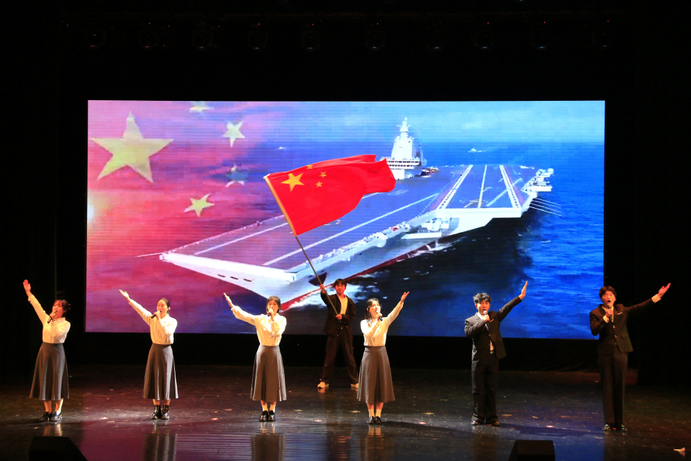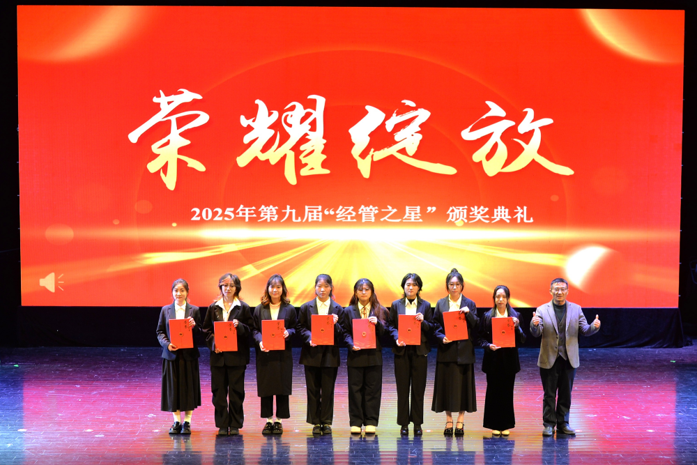 晚会在暖场弹唱《如果呢+有些+晴天》的温柔旋律中拉开帷幕,随后舞蹈串烧接连登场,正式开启晚会精彩篇章。整场晚会分“青春初绽”“青春无界”“青春向光”三大篇章,节目形式丰富多元、亮点纷呈:“青春初绽”篇章,活力满满;“青春无界”篇章,诠释青春姿态,主题走秀创意十足,掀起现场小高潮,趣味游戏让台上台下互动频频;“青春向光”篇章将晚会氛围推向顶点,朗诵与舞蹈《我爱我的祖国》以深情告白抒发赤子情怀,点燃了全场的爱国热情;舞台剧生动展现了青年在时代浪潮中的坚守与奋进;大合唱旋律激昂,为晚会注入厚重精神力量。晚会期间,学院党总支书记陈根怀与院长朱军为第九届“经管之星”学子颁奖,他们的先进事迹激励着在场每一位新生,彰显着榜样的力量。