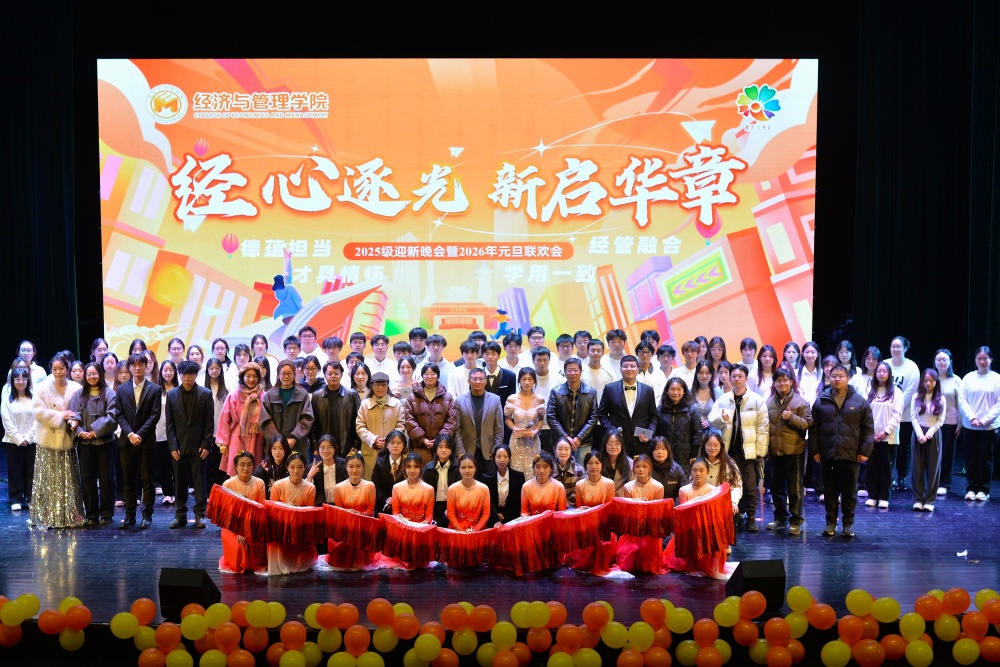 12月12日晚,经济与管理学院“经心逐光 新启华章”2025级迎新晚会暨元旦联欢会于大学生活动中心隆重举行。经济与管理学院全体院领导、教职工代表与2025级全体新生欢聚一堂,共同见证这场融合青春活力与经管特色的视听盛宴。