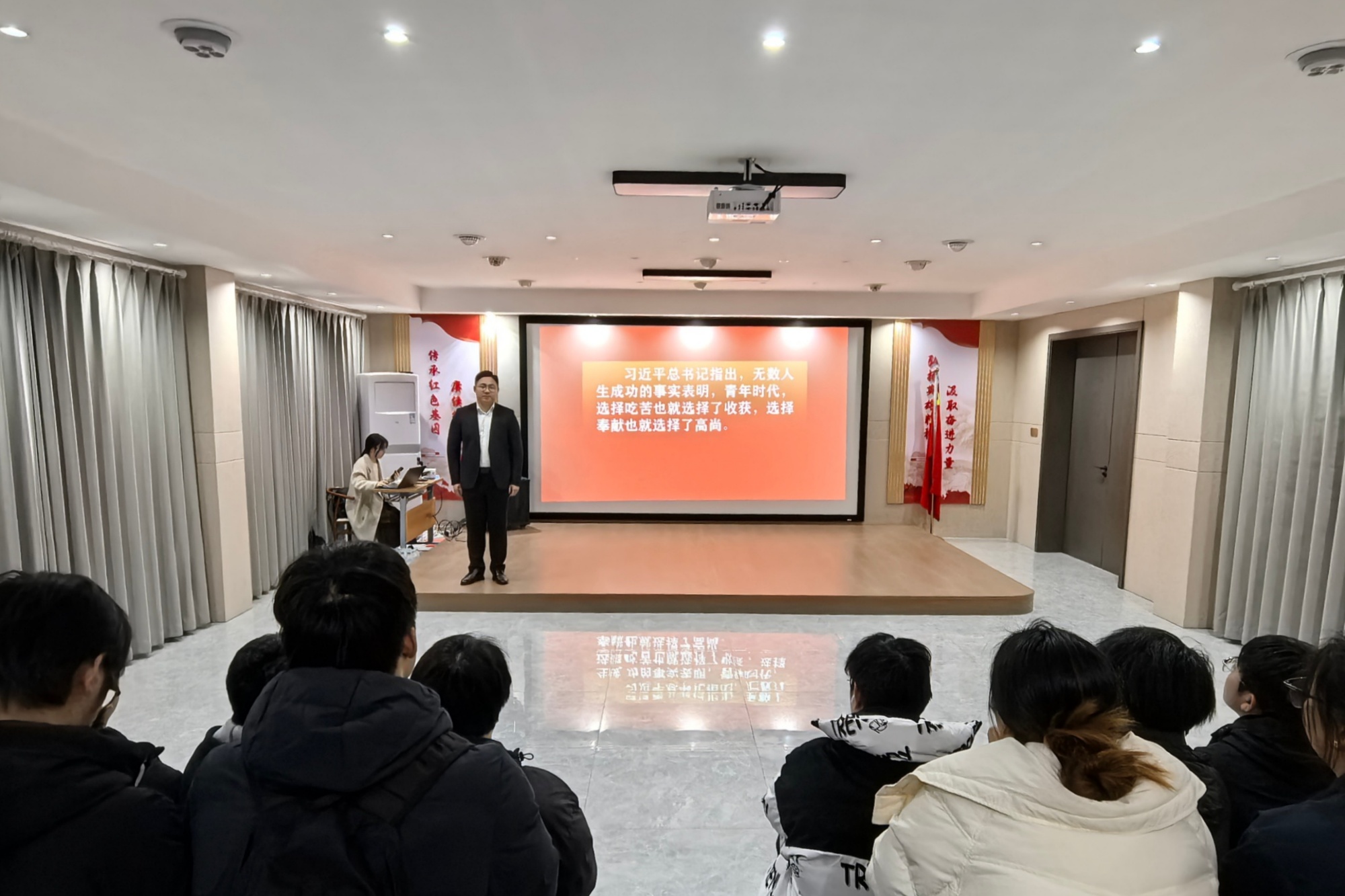 实地研学后,党支部在红色怀旧影院组织集中学习与研讨。活动特邀江苏省青年讲师成杰现场讲授微党课《青春的抉择》,围绕英雄精神的时代价值进行深入阐释。在专题研讨环节,成员结合学生工作实际踊跃发言,表示要将红色基因融入日常育人工作,把学习榜样精神转化为成长成才的实际行动。