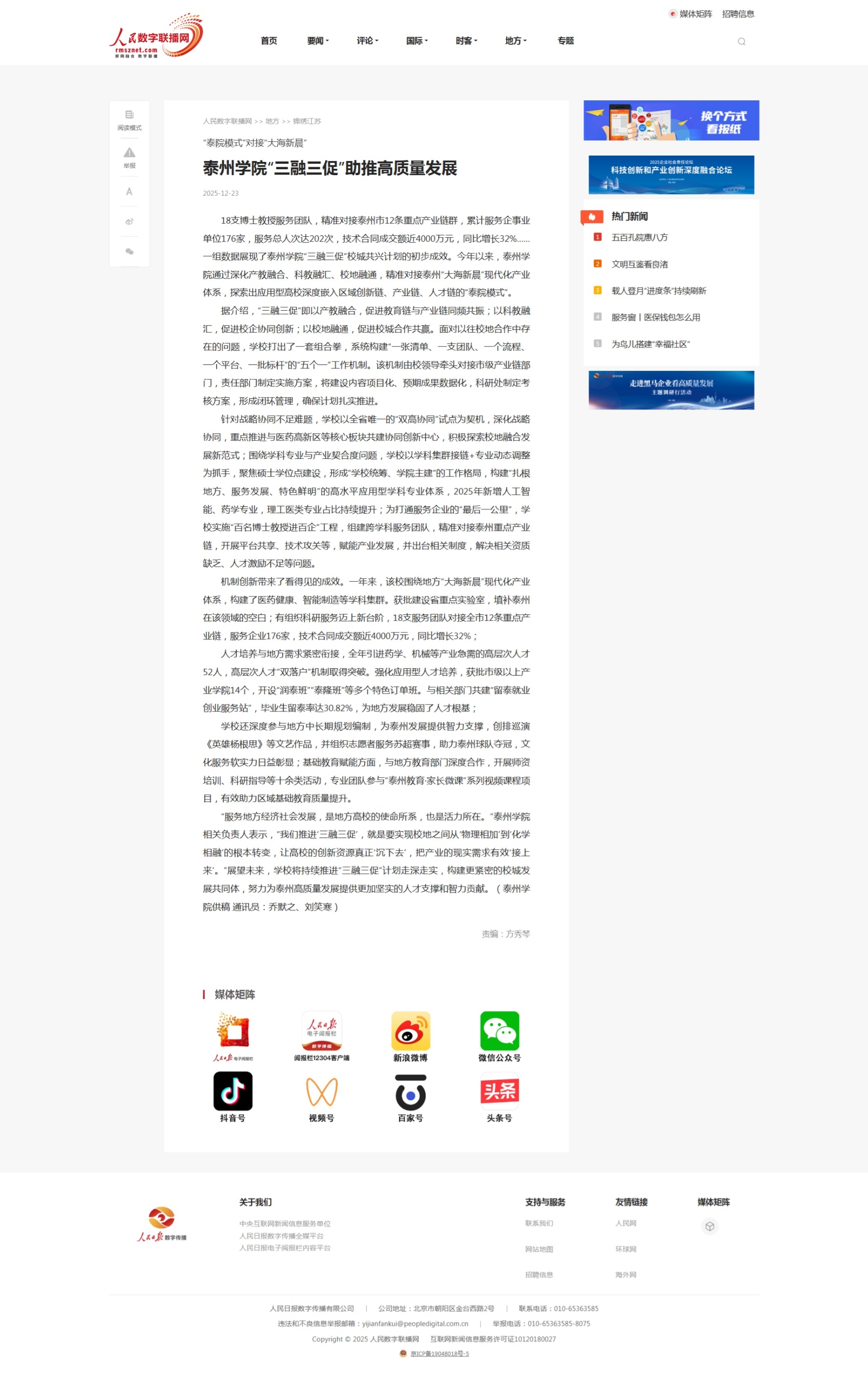 《人民数字联播网》《扬子晚报》《泰州日报》报道Ky开元集团“三融三促”助推高质量发展工作成效