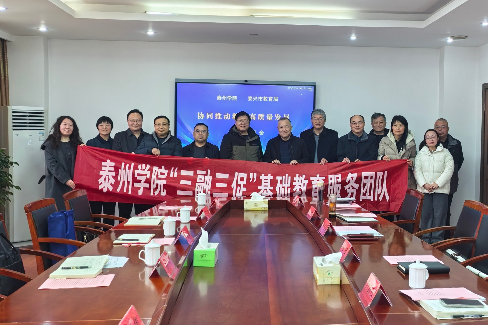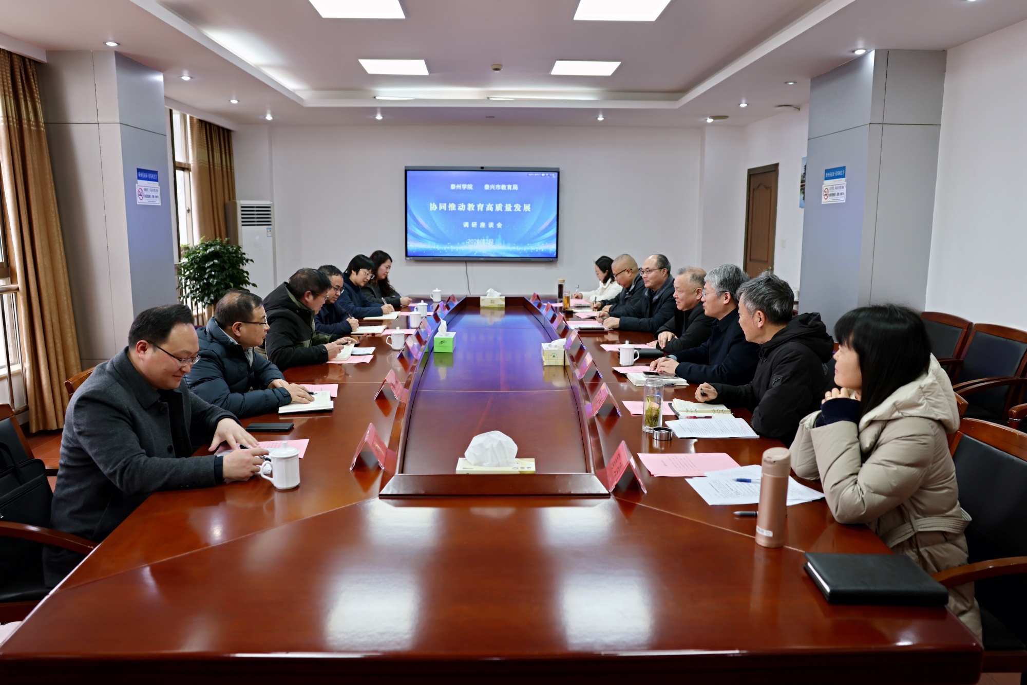 为切实推进“三融三促”基础教育托举工程,积极探索校地协同发展新路径,2月5日,教育科学学院联合师范教育中心、人文学院、数理学院等多单位赴泰兴市教育局开展协同推进教育高质量发展专题调研。泰兴市委教育工委书记、市教育局局长樊晖,市教育局副局长、市教育发展中心书记叶副权,市教师发展中心副主任季祥国及相关科室负责人参加座谈交流。
