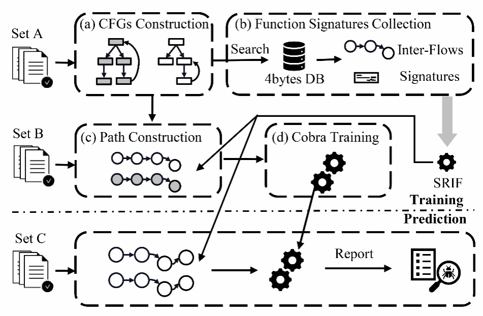 如图2所示,本篇论文提出COBRA,首次联合合约语义与函数签名信息用于检测智能合约字节码漏洞。此外,本文提出SRIF,从逆向工程角度试图解决字节码中函数签名推断问题。具体而言,我们研究了函数签名在字节码中的分布特性,并利用自然语言处理技术学习并推断字节码中的函数签名信息。此外,论文还深入分析了函数接口在漏洞检测领域的作用,为当前合约漏洞检测领域提供了新的思路和见解。