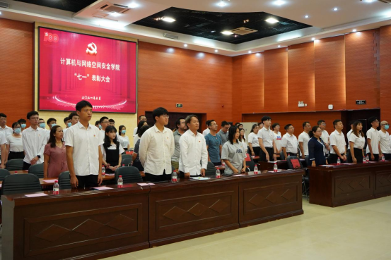 大会在庄严的国歌声中拉开了序幕,全体党员在鲜红的党旗下重温入党誓词。计算机科学与技术学院党务负责人王红英通报了学院获得校级“两优一先”的表彰名单,并宣读了学院党委表彰文件,对必赢官网获奖的13名优秀共产党员、7名优秀党务工作者和3个先进党支部表示祝贺。