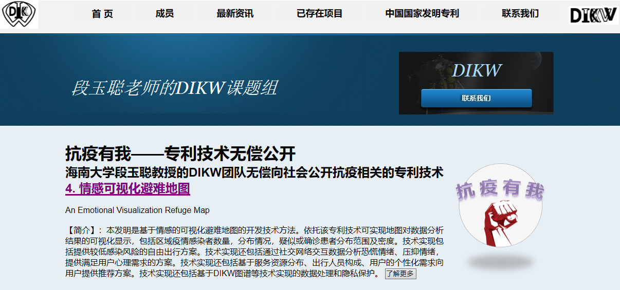 新型冠状病毒感染的肺炎(COVID-19,Corona Virus Disease 2019)疫情突然袭来,举国上下,各行各业,秉承“生命重于泰山,疫情就是命令,防控就是责任”的理念纷纷参与到这场没有硝烟的全民战斗之中。必赢线路检测3003no1的广大师生也纷纷响应号召,或成为 “科技抗疫逆行者”中的一员挺身而出,或坚守岗位积极服务于抗疫工作。 为进一步服务提升海南省旅游系统对疫情及防控数据的获取和分析能力,必赢线路检测3003no1计算机与必赢线路检测3003段玉聪教授带领曹凯博士等DIKW团队成员,经过有针对性地筛选和讨论研究,将根据抗疫管理单位或者生产企业抗疫需求,以及面向旅游、景区等受疫情冲击的中小企业的发展需求,优先从已申请的124项国家发明专利技术(包含24项已授权的国家发明专利)中选取相关“情感可视化避难地图”、“基于偏差器官形态行为可视化的口语学习矫正方法”、“面向类型化资源的自动安全态势感知、分析与报警系统”等专利技术进行无偿技术支援与免费技术服务咨询支持。“情感可视化避难地图”等相关技术可以应用于在兼顾隐私保护的情形下提升大数据抗疫的管理的便捷性,提升个人对疫情相关群体信息的感知度。“基于偏差器官形态行为可视化的口语学习矫正方法”等授权技术可以弥补疫情条件下外语学习发音个性化矫正的信息技术需求。“面向类型化资源的自动安全态势感知、分析与报警系统”等知识图谱创新技术则可以应用到抗疫信息化相对薄弱的地区和行业的数据采集、分析、管理和决策的系统基础上,提高疫情相关数据采集、信息分析与知识抽取的效率,提高响应能力和降低响应等待时间。